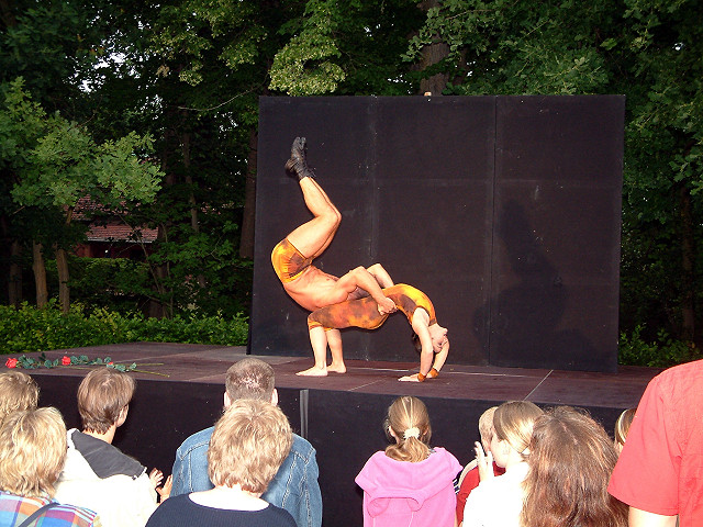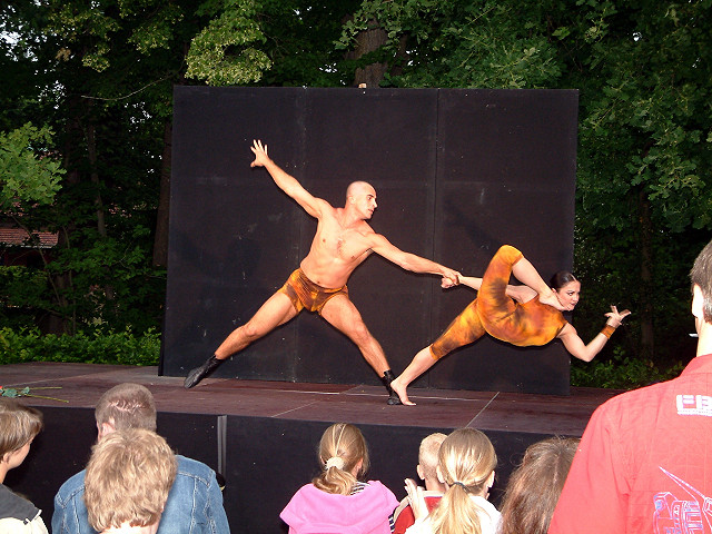 "Akrobatik-Duett" Ein brillantes optisches Schauspiel, eine Kunstschau zwischen Traum und Wirklichkeit, mit Kontorsion, Handstand, Tanz und akrobatischen Figuren. Das Duo wird zur lebenden Skulptur: Ineinander verschlungene Gliedmaßen voller Anmut und Schönheit.