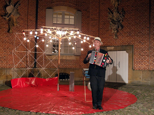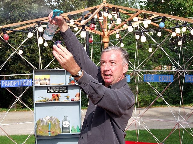 Theater für flanierendes Publikum, drinnen und draußen. Grosche präsentiert in der Figur des