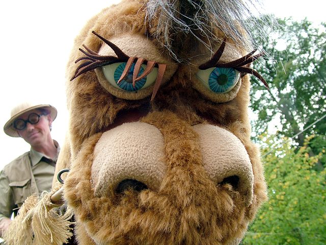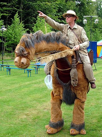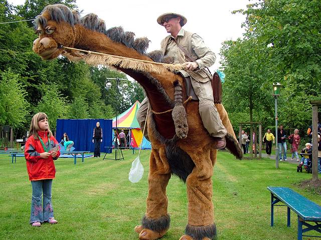 Die Stelzenfigur für Kulturfeste mit all den Attributen behaftet,