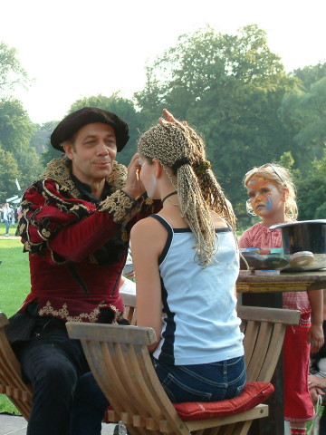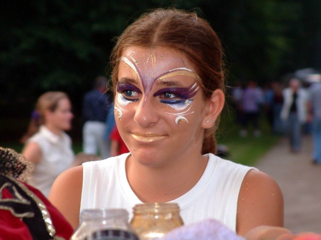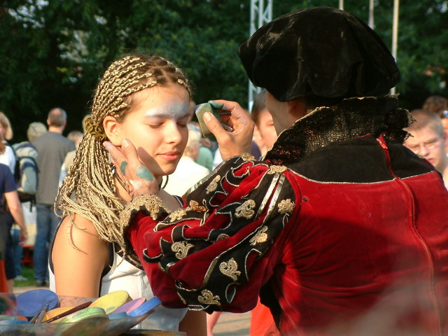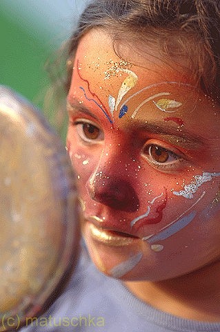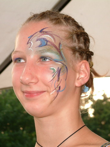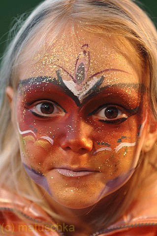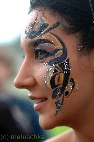 Ein winzig, dezenter Schmuck für einen Abend. Auf Gesichtern enstehen hauchdünne, individuelle Ornamente, die sich in Minuten in die Landschaft des jeweiligen Antlitzes hineinschmiegen. Kleine, aufblitzende Kunstwerke im Publikum erzählen geheimnisvolle Geschichten aus der Welt der Farben und tragen zum Glanz einer festlichen Atmosphäre bei: