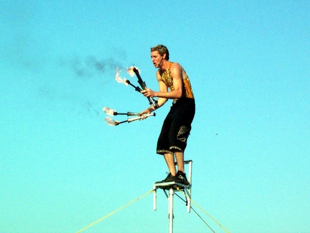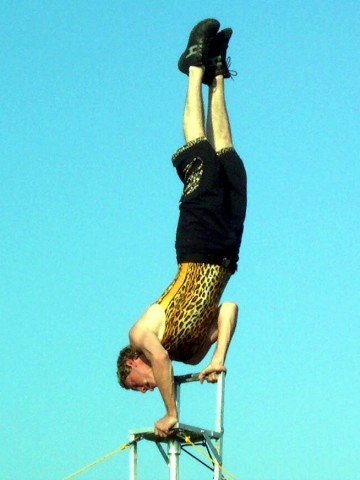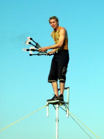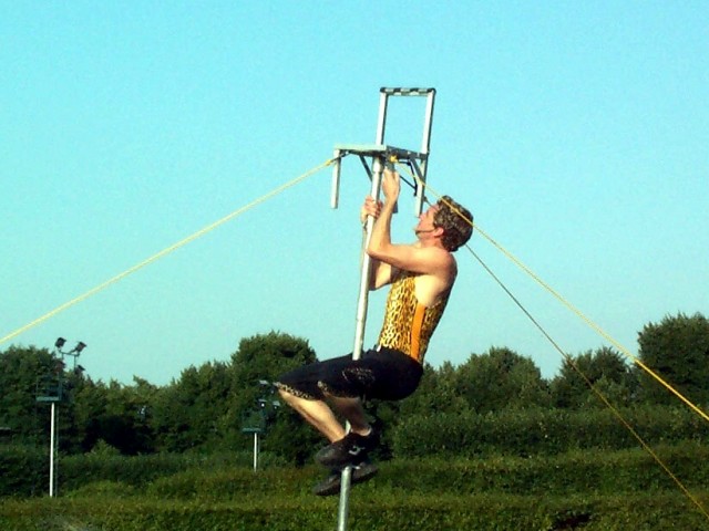 Jonglage in einem Gelben Kostüm mit schwarzen Punkten. Wenn man den Bildern glauben darf sogar auf einer Stange :-).